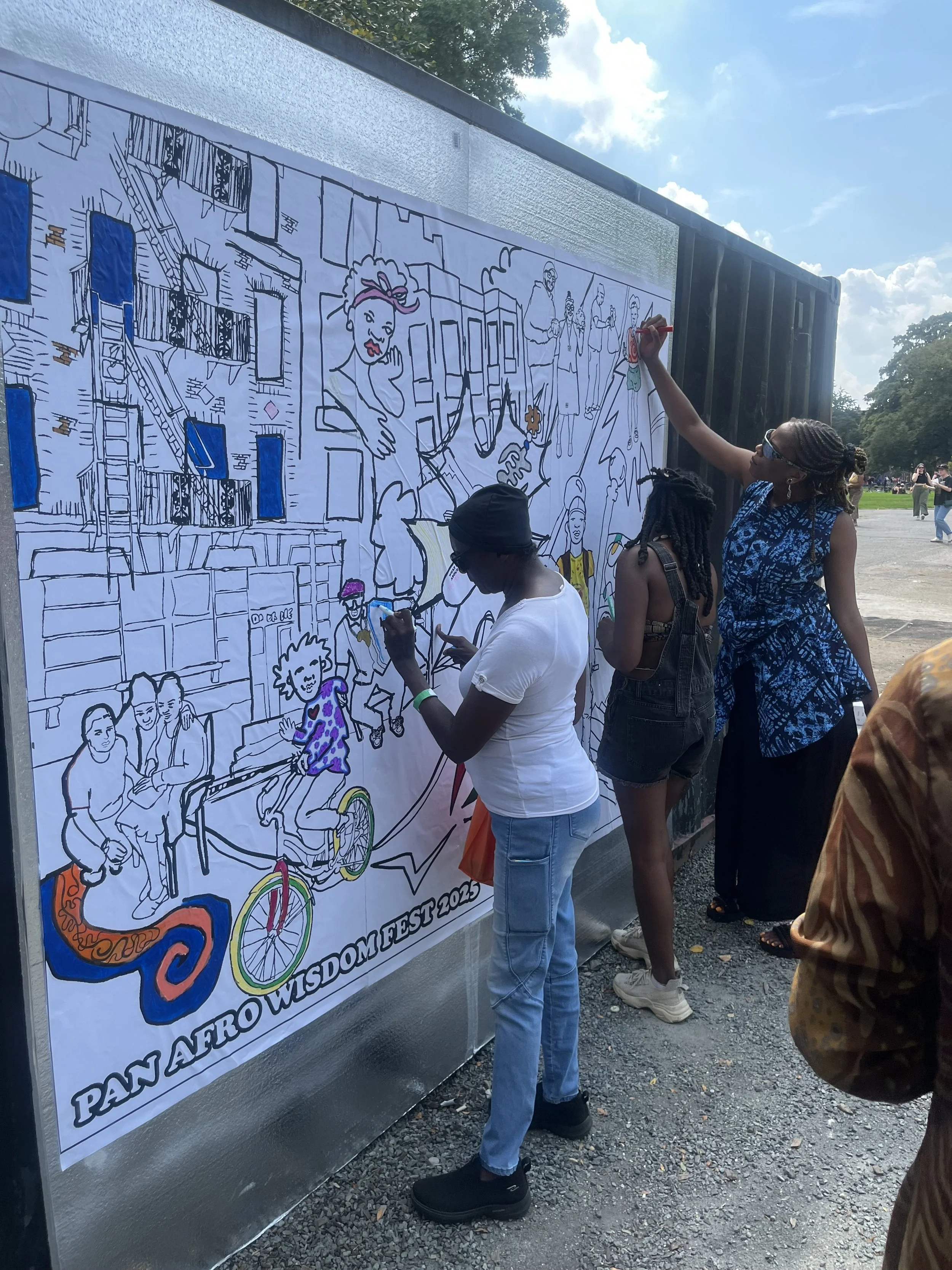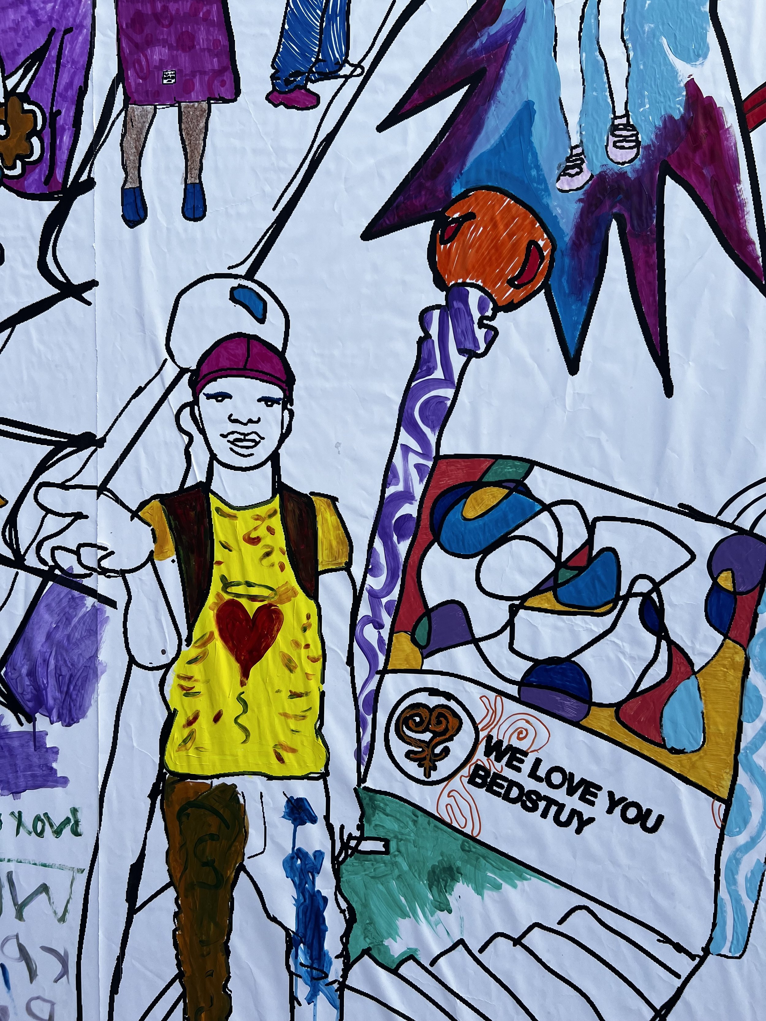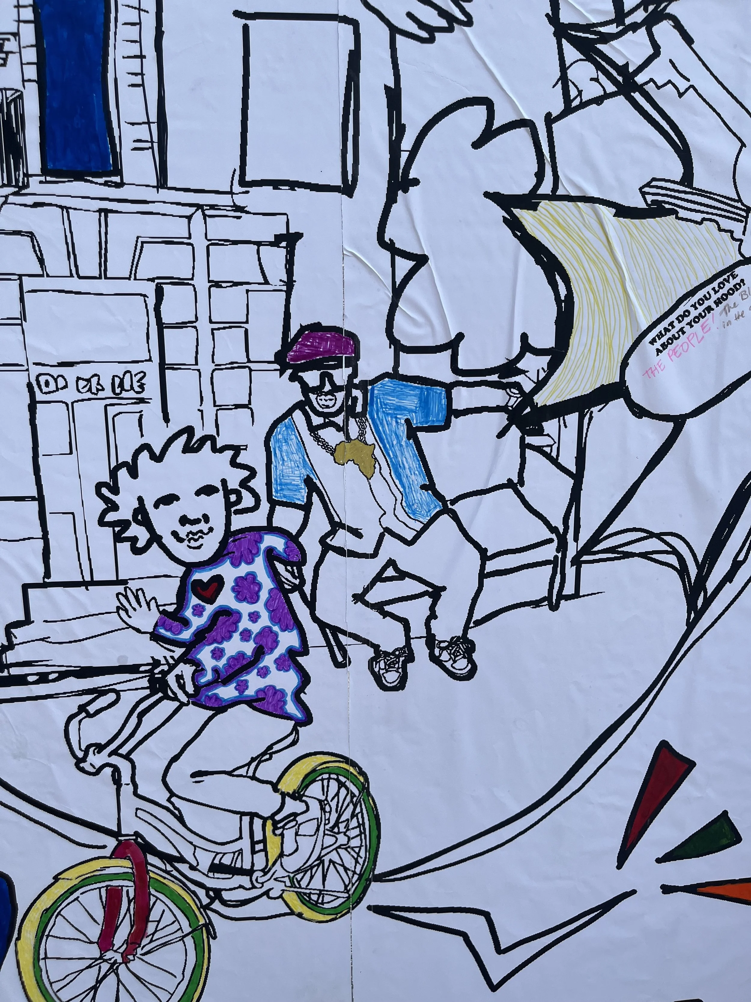 FOR THIS YEAR’S ANNUAL “PAN AFRO-WISDOM FEST,” A MUSIC FESTIVAL DEVOTED TO BLACK QUEER HEALING HOSTED BY DIVINE TIMES COLLECTIVE, I DREW A COLLABORATIVE MURAL AND COLORING PAGE TITLED “THE KEYS.” THE ONLY PROMPT WAS “WHAT IF BEDSTUY WAS A BLACK UTOPIA?”